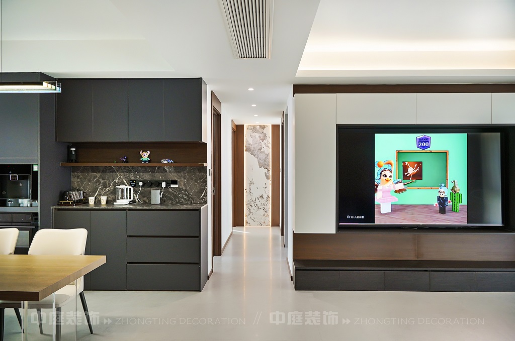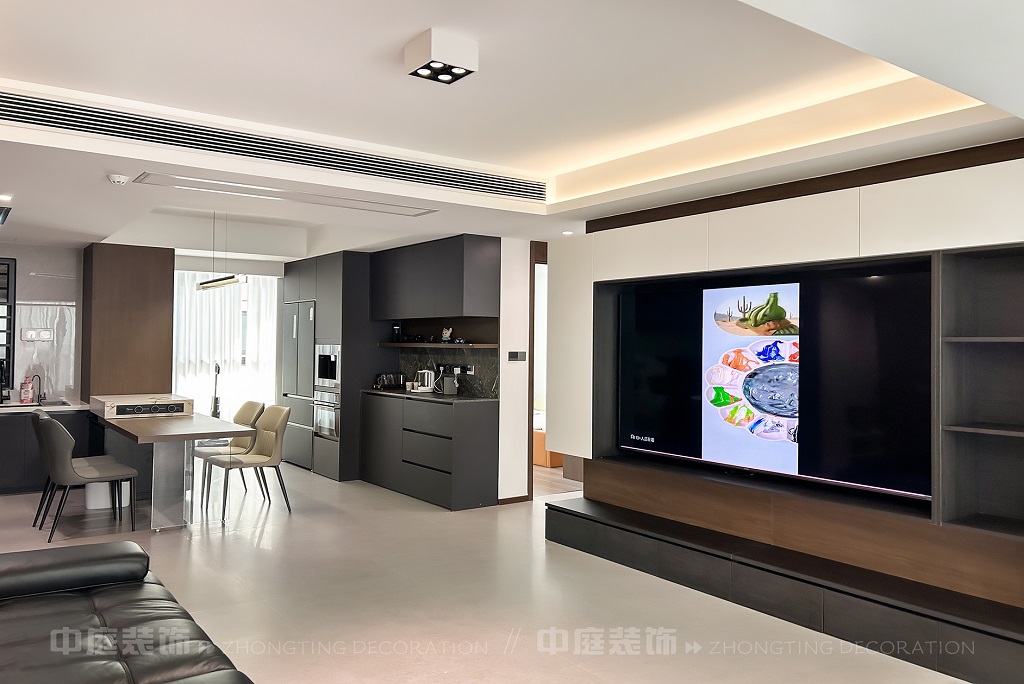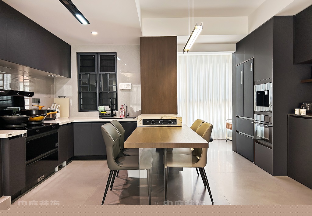 瀏覽量:39客廳以現(xiàn)代黑白灰極簡風(fēng)格為核心,大面積白紗簾引入自然光線,黑色皮質(zhì)沙發(fā)質(zhì)感高級。開放式布局,深灰櫥柜與木質(zhì)餐桌形成材質(zhì)對比,線性吊燈提升精致感,功能與美學(xué)兼具,營造現(xiàn)代簡約的烹飪用餐氛圍。輕柔窗簾與柔和燈光,打造靜謐休息空間。精致的材質(zhì)選擇與合理的功能規(guī)劃,詮釋了“少即是多”的現(xiàn)代簡約居住美學(xué)。